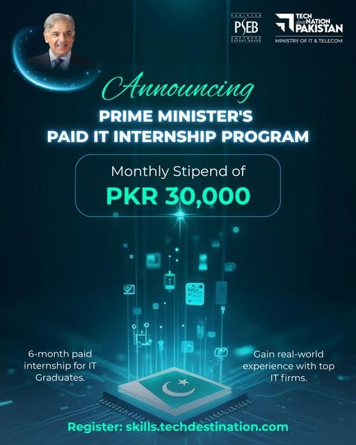 Prime Minister’s Youth Program – Industry Placement The Ministry of IT & Telecom (MoITT) and Pakistan Software Export Board (PSEB) invite applications for the 6-month paid Industry Placement Program. Eligible IT graduates will receive a monthly stipend of PKR 30,000 while gaining hands-on experience with leading IT companies. Apply now: skills.techdestination.com