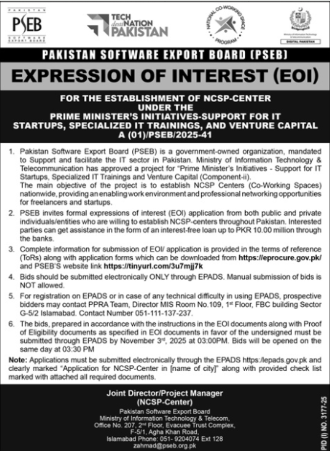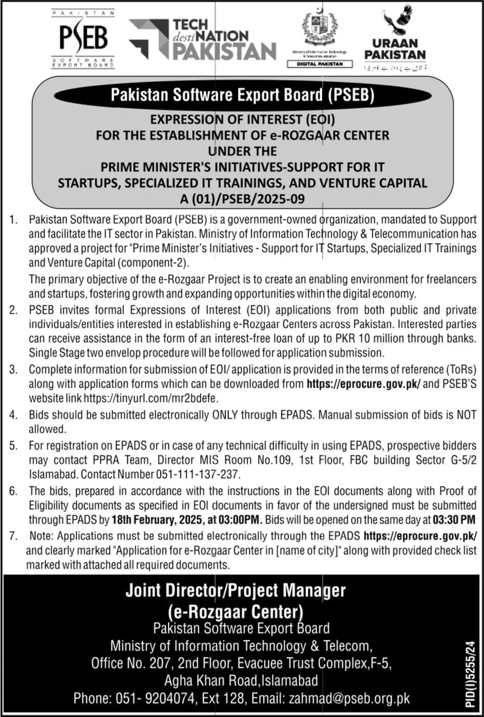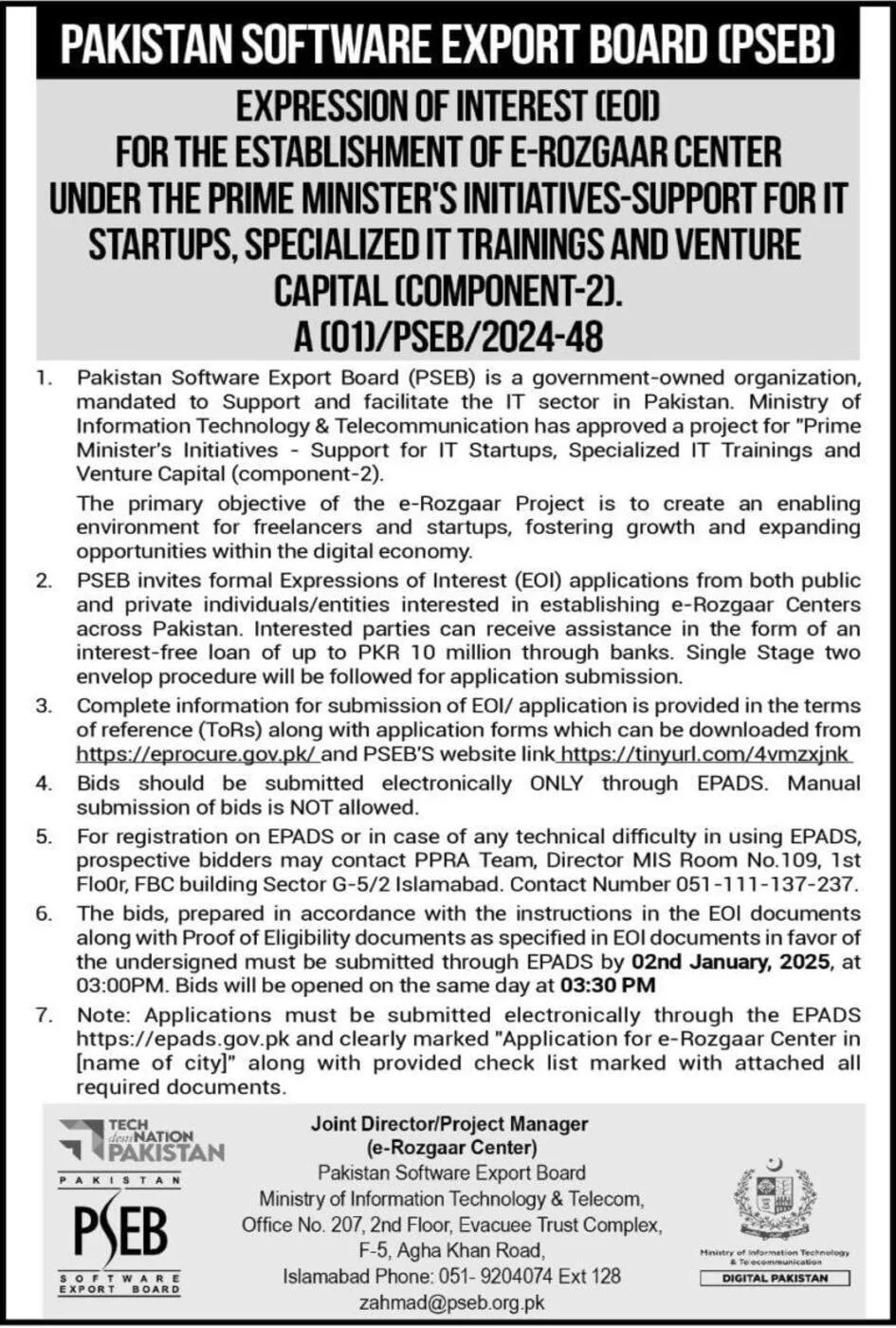 Expression Of Interest (EoI) For The Establishment Of E-rozgaar Center Under The Prime Minister’s Initiatives Support For IT Startups, Specialized IT Training.