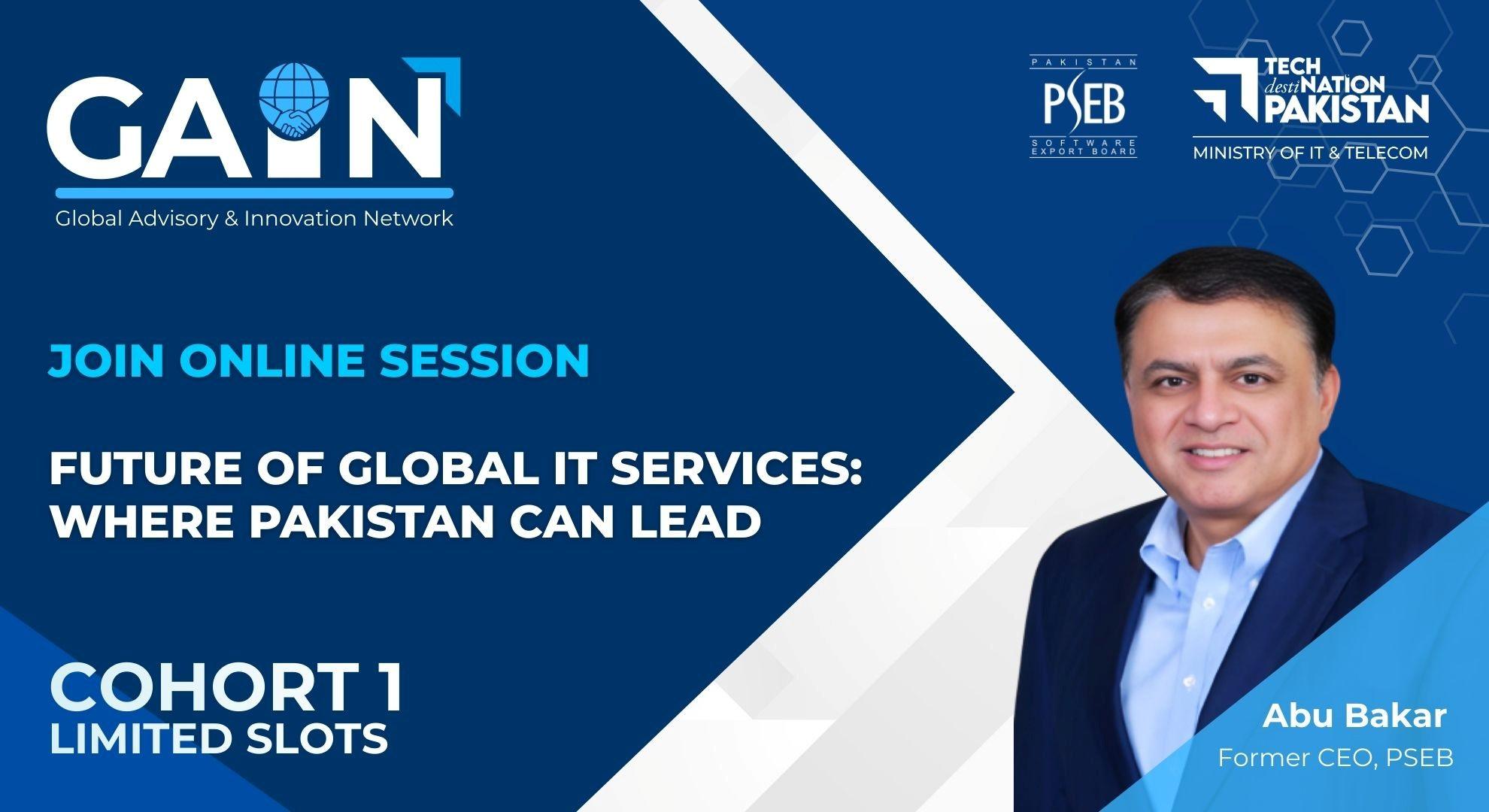 Pakistan Software Export Board (PSEB) invites its registered IT and ITeS companies to participate in the upcoming GAIN Online Awareness & Engagement Session on “Future of Global IT Services: Where Pakistan Can Lead” scheduled for Wednesday, 17 December 2025 from 4:00–6:00 PM (PST).