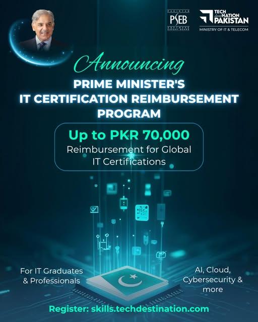 The Ministry of IT & Telecom (MoITT), through the Pakistan Software Export Board (PSEB), under the Prime Minister’s Youth Program (PMYP), is providing up to PKR 70,000 reimbursement for approved international IT certifications.